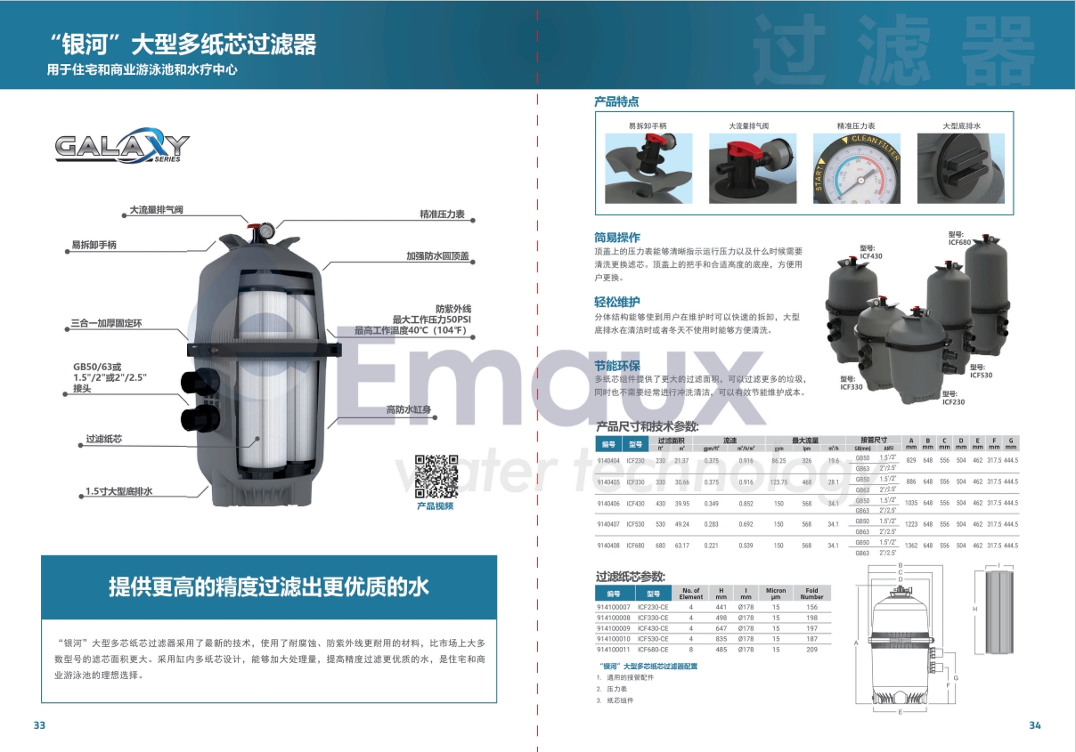 “銀河”大型多芯紙芯過濾器采用了最新的技術,使用了耐腐蝕、防紫外線更耐用的材料,比市場上大多數型號的濾芯面積更大。采用缸內多紙芯設計,能夠加大處理量,提高精度過濾更優(yōu)質的水,是住宅和商業(yè)游泳池的理想選擇。