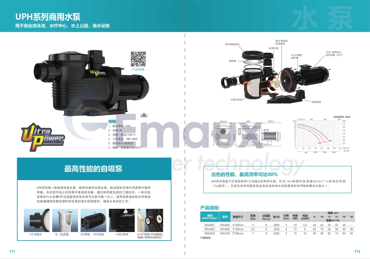 UPH系列是一款極高性能水泵,極高性能的自吸水泵。能達(dá)到在市場中同類泵中最高質(zhì)量,在實(shí)現(xiàn)市場上同類泵中最高的流量。通過利用最先進(jìn)的工程技術(shù),一體式成型泵體與大容量8升過濾籃使其在所有可比泵中獨(dú)一無二。采用耐腐蝕和耐化學(xué)腐蝕的玻璃增強(qiáng)熱塑性塑料和優(yōu)質(zhì)的海水機(jī)械密封,確保長壽命的工作。