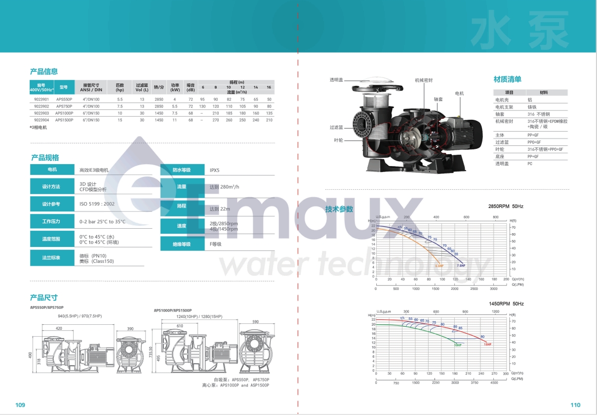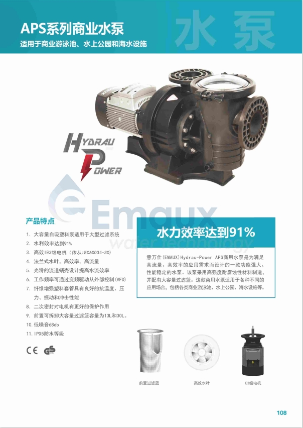 意萬(wàn)仕(EMAUX)Hydrau-Power APS商用水泵是為滿足高流量、高效率的應(yīng)用需求而設(shè)計(jì)的一款功能強(qiáng)大、性能穩(wěn)定的水泵。該泵采用高強(qiáng)度耐腐蝕性材料制造,并配有大容量過(guò)濾籃。這款商用水泵適用于各種不同的應(yīng)用場(chǎng)合,包括各類商業(yè)游泳池、水上公園、海水設(shè)施等。