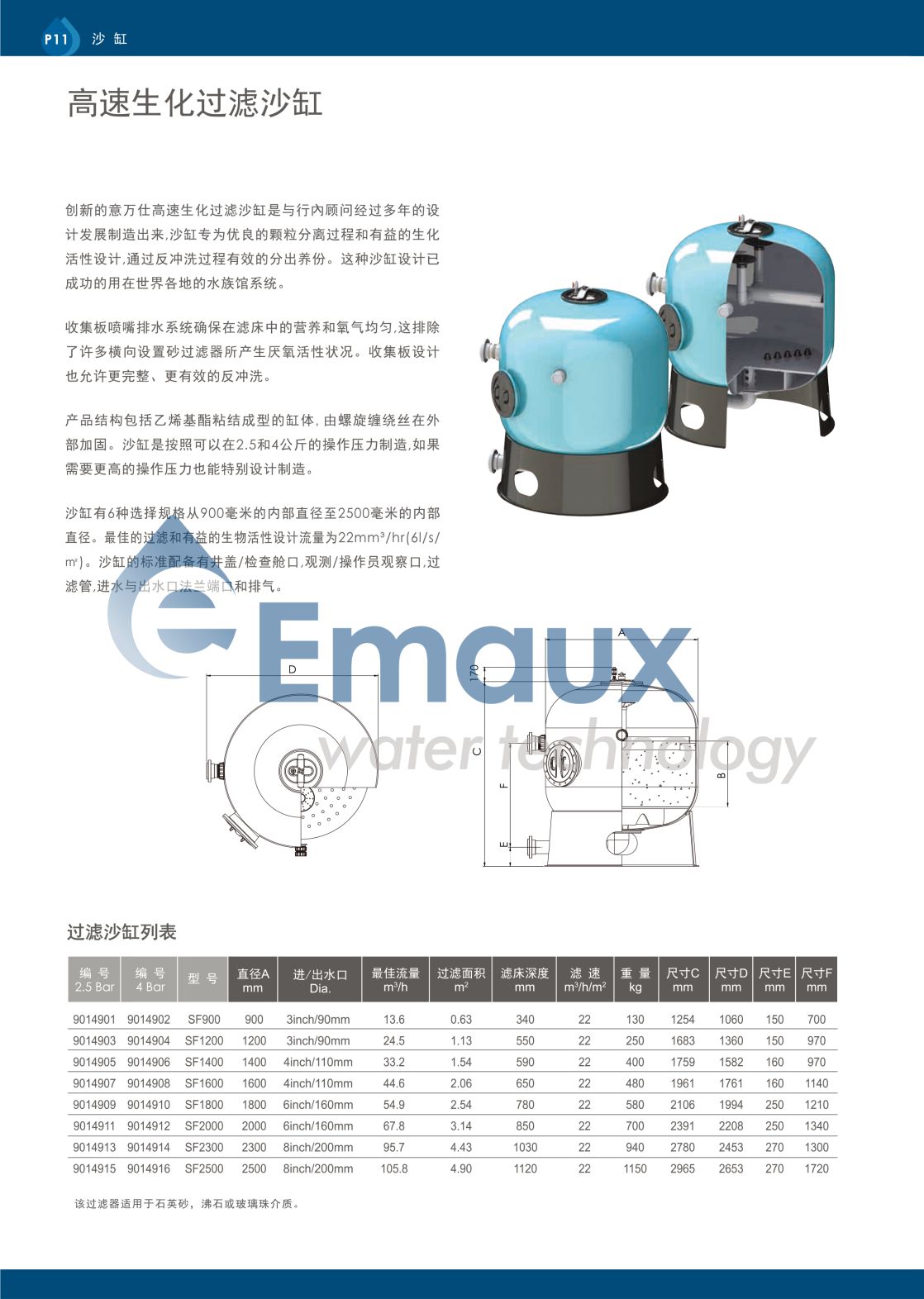 競(jìng)技池創(chuàng)新的意萬仕高速生化過濾沙缸是與行內(nèi)顧問經(jīng)過多年的設(shè)計(jì)發(fā)展制造出來,沙缸專為優(yōu)良的顆粒分離過程和有益的生化活性設(shè)計(jì)通過反沖洗過程有效的分出養(yǎng)份。 這種沙缸設(shè)計(jì)已成功的用在世界各地的水族館系統(tǒng)。 收集板噴嘴排水系統(tǒng)確保在濾床中的營(yíng)養(yǎng)和氧氣均勻,這排除了許多橫向設(shè)置砂過濾器所產(chǎn)生厭氧活性狀況。 收集板設(shè)計(jì)也允許更完整、更有效的反沖洗。 產(chǎn)品結(jié)構(gòu)包括乙烯基酷粘結(jié)成型的缸體, 由螺旋纏繞絲在外部加固。 沙缸是按照可以在2.5和4公斤的操作壓力制造,如果需要更高的操作壓力也能特別設(shè)計(jì)制造。 沙缸有6種選擇規(guī)格從900毫米的內(nèi)部直徑至2500毫米的內(nèi)部 直徑。 最佳的過濾和有益的生物活性設(shè)計(jì)流量為22mm3/hr(61/s/ m')。 沙缸的標(biāo)準(zhǔn)配備有井蓋/檢查艙口觀測(cè)/操作員觀察口過 濾管進(jìn)水與出水口法蘭端口和排氣。