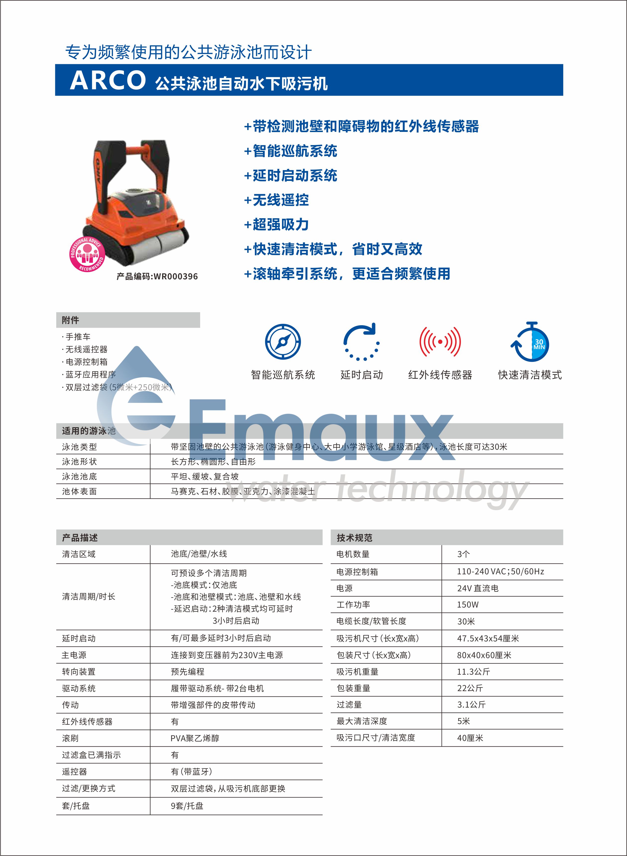 ★氣旋抽吸技術+超強吸污能力 ★雙層過濾袋 ★滾軸牽引系統(tǒng),更適合頻繁使用 ★帶檢測池壁和障礙物的紅外線傳感器 ★無線遙控,能手動能定點操作清潔 ★智能巡航系統(tǒng) ★配有手推車,使用更方便 ★專為頻繁使用的公共游泳池而設計