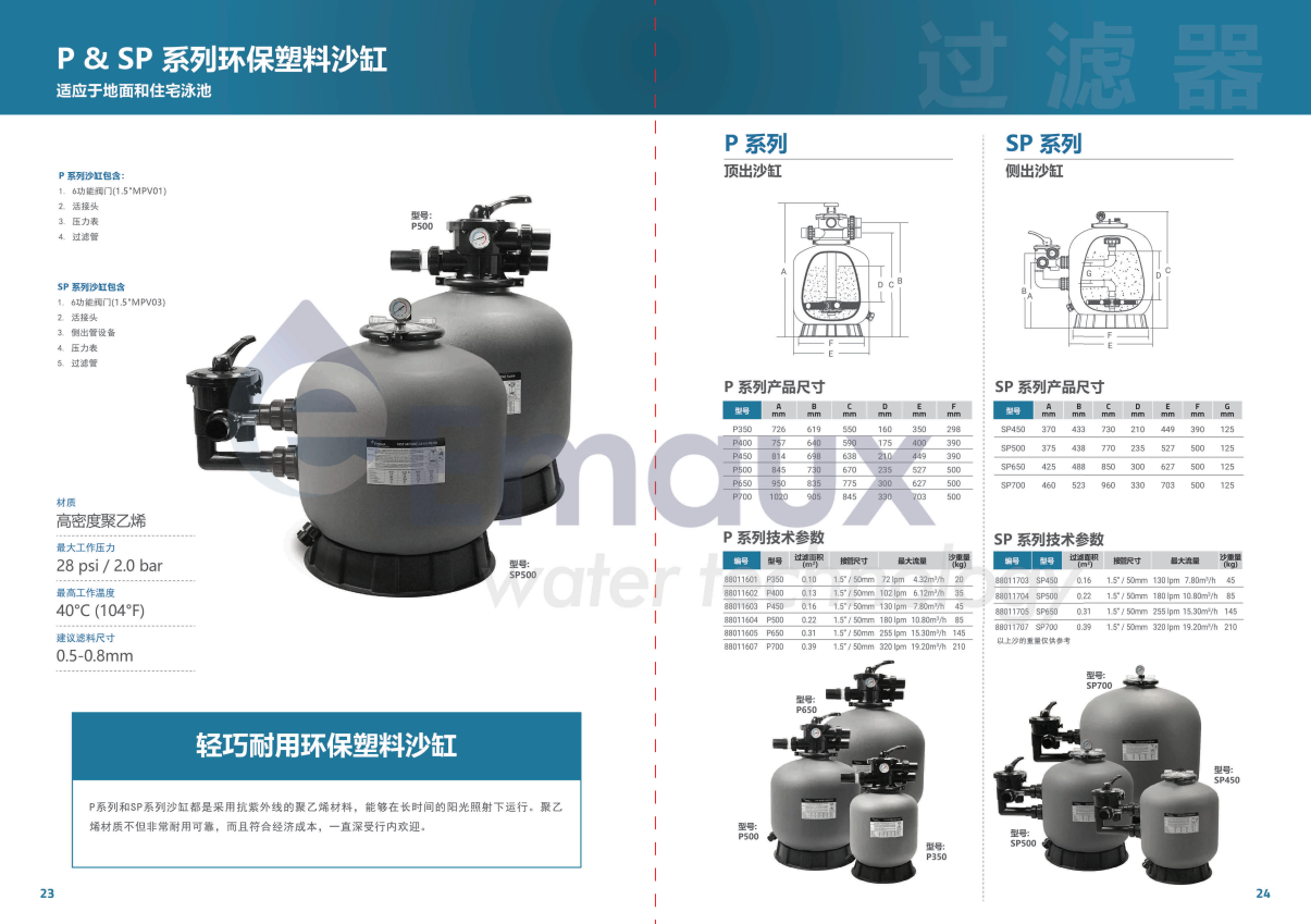 競(jìng)技池P系列和SP系列沙缸都是采用抗紫外線的聚乙烯材料,能夠在長(zhǎng)時(shí)間的陽(yáng)光照射下運(yùn)行。聚乙烯材質(zhì)不但非常耐用可靠,而且符合經(jīng)濟(jì)成本,一直深受行內(nèi)歡迎。
