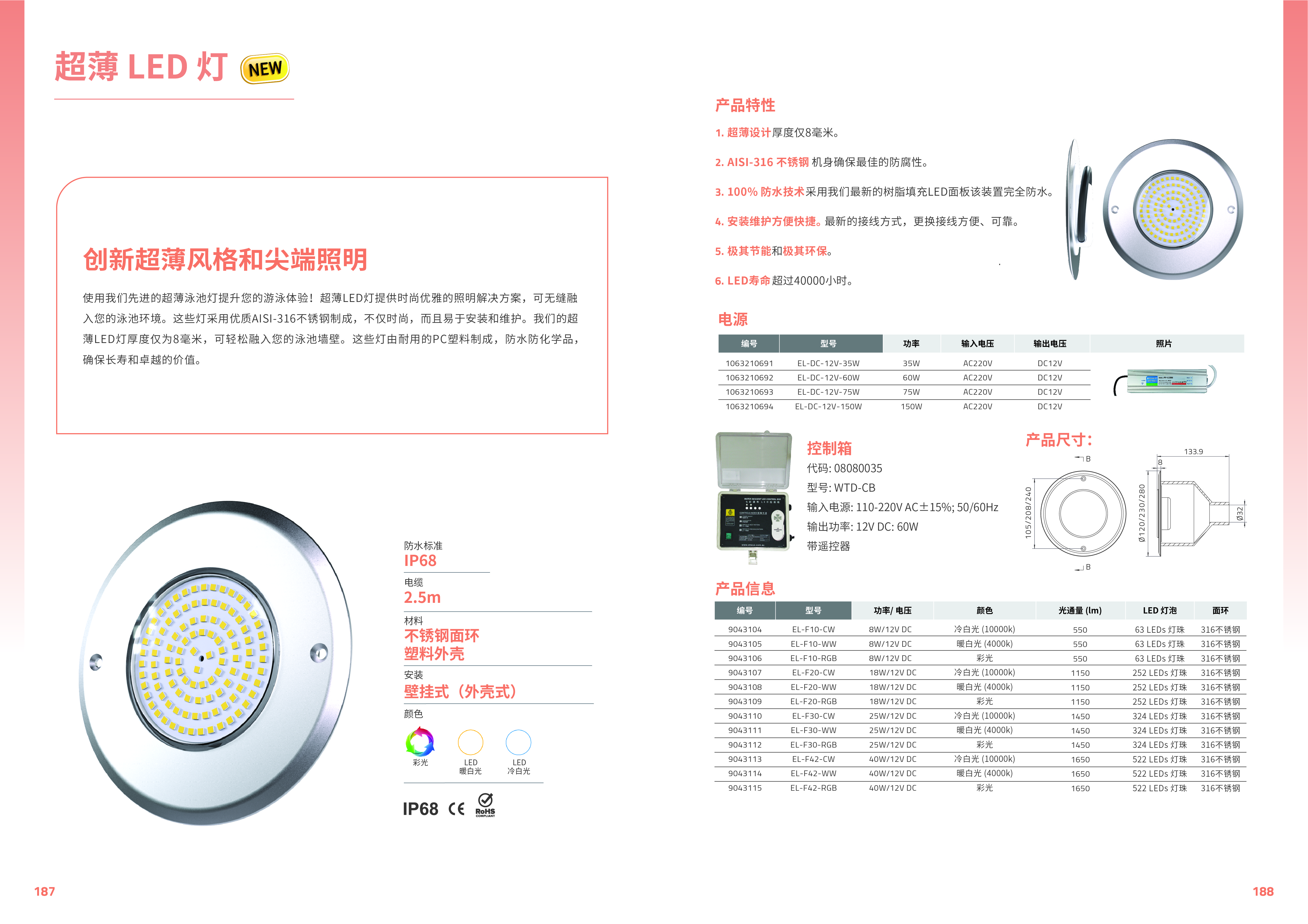 競技池使用我們先進的超薄泳池燈提升您的游泳體驗!超薄LED燈提供時尚優(yōu)雅的照明解決方案,可?縫融 入您的泳池環(huán)境。這些燈采用優(yōu)質(zhì)AISI?316不銹鋼制成,不僅時尚,?且易于安裝和維護。我們的超 薄LED燈厚度僅為8毫?,可輕松融入您的泳池墻壁。這些燈由耐用的PC塑料制成,防水防化學品, 確保長壽和卓越的價值。