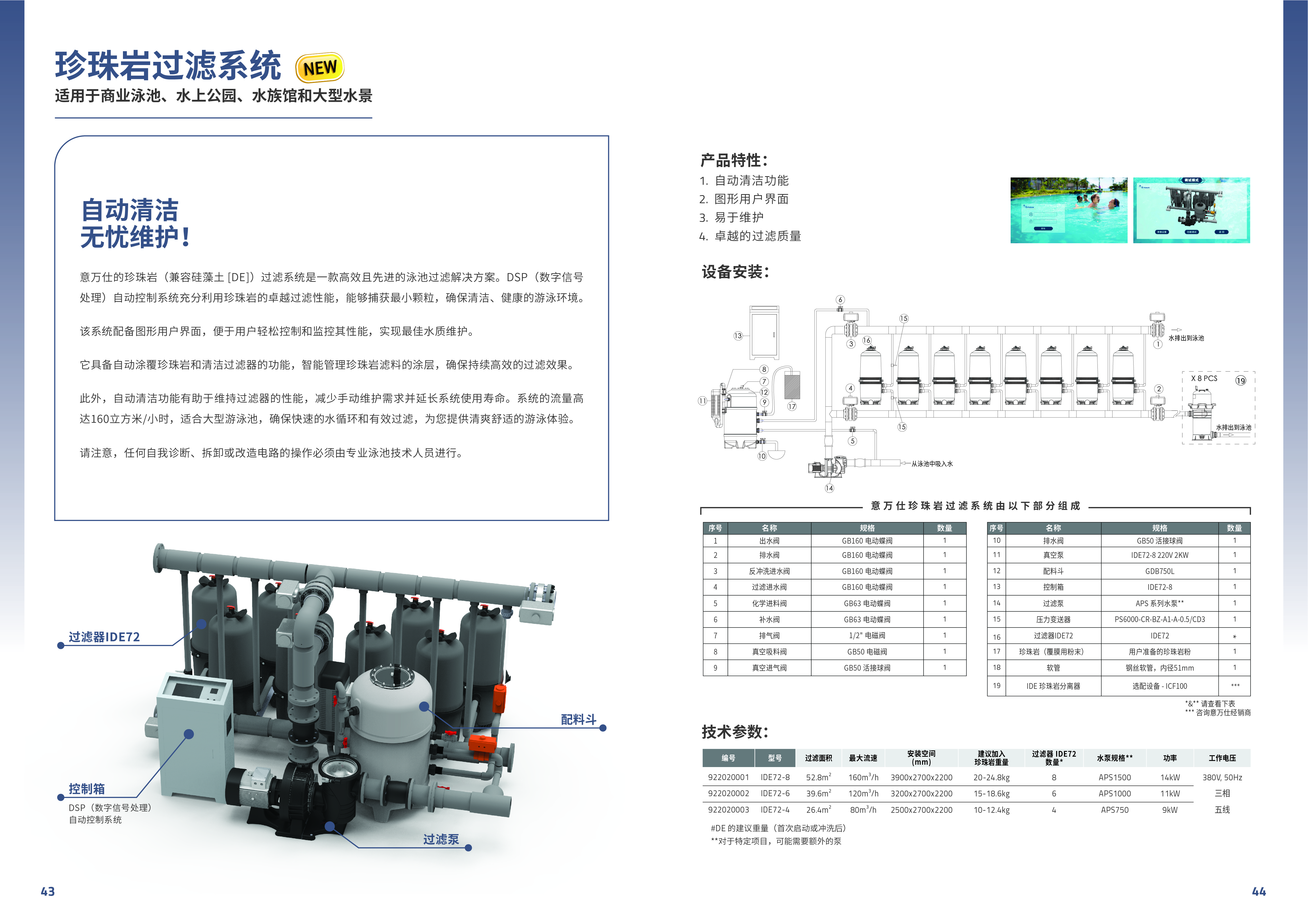 競(jìng)技池意萬(wàn)仕的珍珠巖(兼容硅藻土 [DE])過(guò)濾系統(tǒng)是一款高效且先進(jìn)的泳池過(guò)濾解決方案。DSP(數(shù)字信號(hào) 處理)自動(dòng)控制系統(tǒng)充分利用珍珠巖的卓越過(guò)濾性能,能夠捕獲最小顆粒,確保清潔、健康的游泳環(huán)境。 該系統(tǒng)配備圖形用戶(hù)界面,便于用戶(hù)輕松控制和監(jiān)控其性能,實(shí)現(xiàn)最佳水質(zhì)維護(hù)。 它具備自動(dòng)涂覆珍珠巖和清潔過(guò)濾器的功能,智能管理珍珠巖濾料的涂層,確保持續(xù)高效的過(guò)濾效果。 此外,自動(dòng)清潔功能有助于維持過(guò)濾器的性能,減少手動(dòng)維護(hù)需求并延長(zhǎng)系統(tǒng)使用壽命。系統(tǒng)的流量高 達(dá)160立方米/小時(shí),適合大型游泳池,確??焖俚乃h(huán)和有效過(guò)濾,為您提供清爽舒適的游泳體驗(yàn)。 請(qǐng)注意,任何自我診斷、拆卸或改造電路的操作必須由專(zhuān)業(yè)泳池技術(shù)人員進(jìn)行。