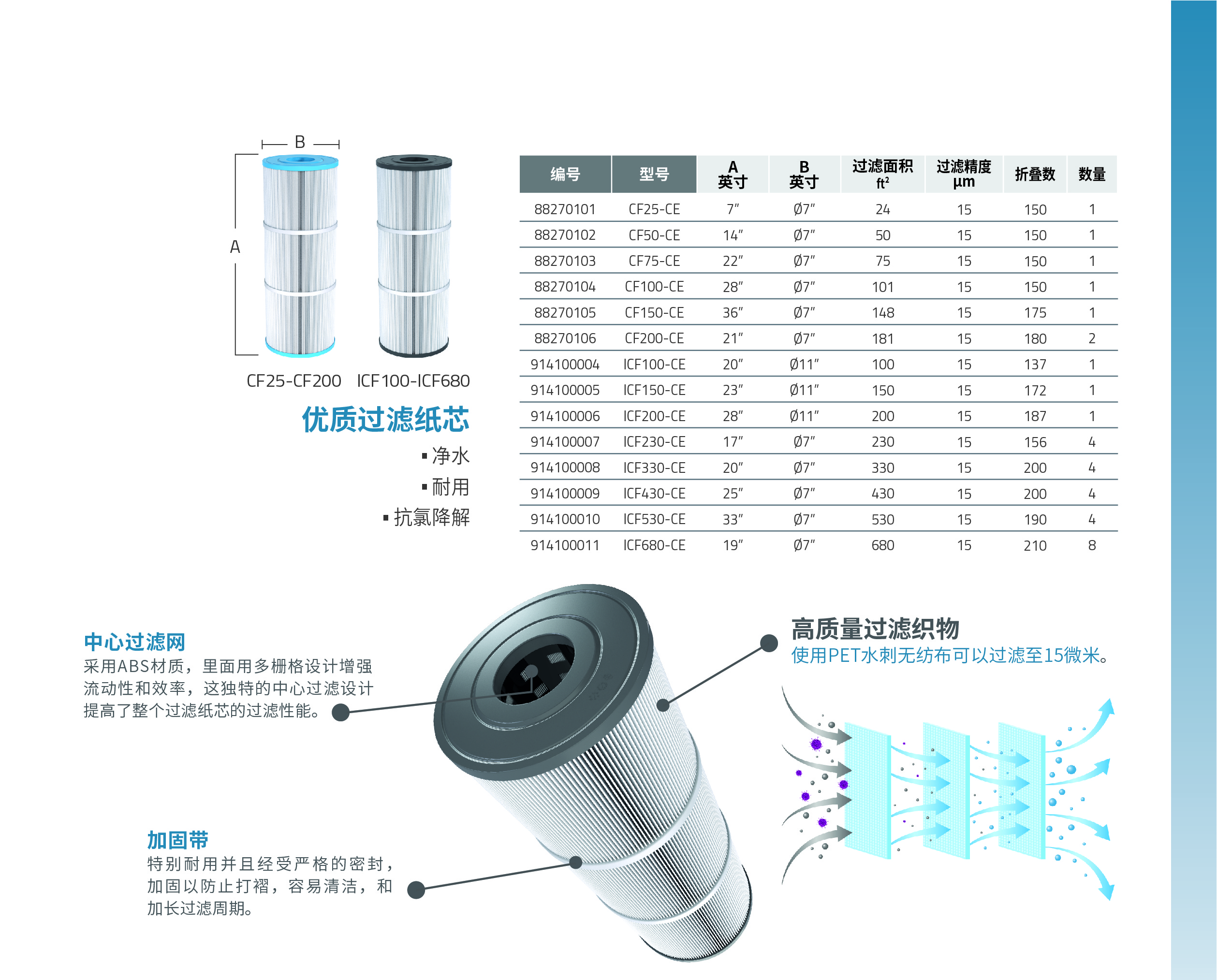 意萬仕過濾紙芯是一種先進的過濾解決方案,旨在提升泳池水質(zhì),確保游泳環(huán)境更加清潔和健康。這些濾 芯采用高密度材料制造,提供多種微米等級和材料選擇,能夠有效過濾小至5微米的顆粒,去除水中的沉積 物、污垢和污染物。 意萬仕過濾紙芯采用優(yōu)質(zhì)織物材料,能夠有效過濾泳池或水療池水中的污垢、碎屑和其他顆粒。其設(shè)計堅 固耐用,配備穩(wěn)固的框架和優(yōu)質(zhì)材料,能夠抵抗氯降解,滿足過濾需求。 與意萬仕過濾器兼容,安裝和維護簡單,是泳池業(yè)主的理想選擇。我們提供多種尺寸和配置,確保您能找 到適合特定泳池或水療池的過濾元件。 通過使用意萬仕過濾紙芯,用戶不僅能享受到卓越的水質(zhì)清澈度,還能提升過濾系統(tǒng)的使用壽命和效率。 為了保持水質(zhì)清潔、清澈且無污染,意萬仕過濾紙芯是最佳選擇。讓意萬仕創(chuàng)新的過濾紙芯升級您的泳池 體驗!
