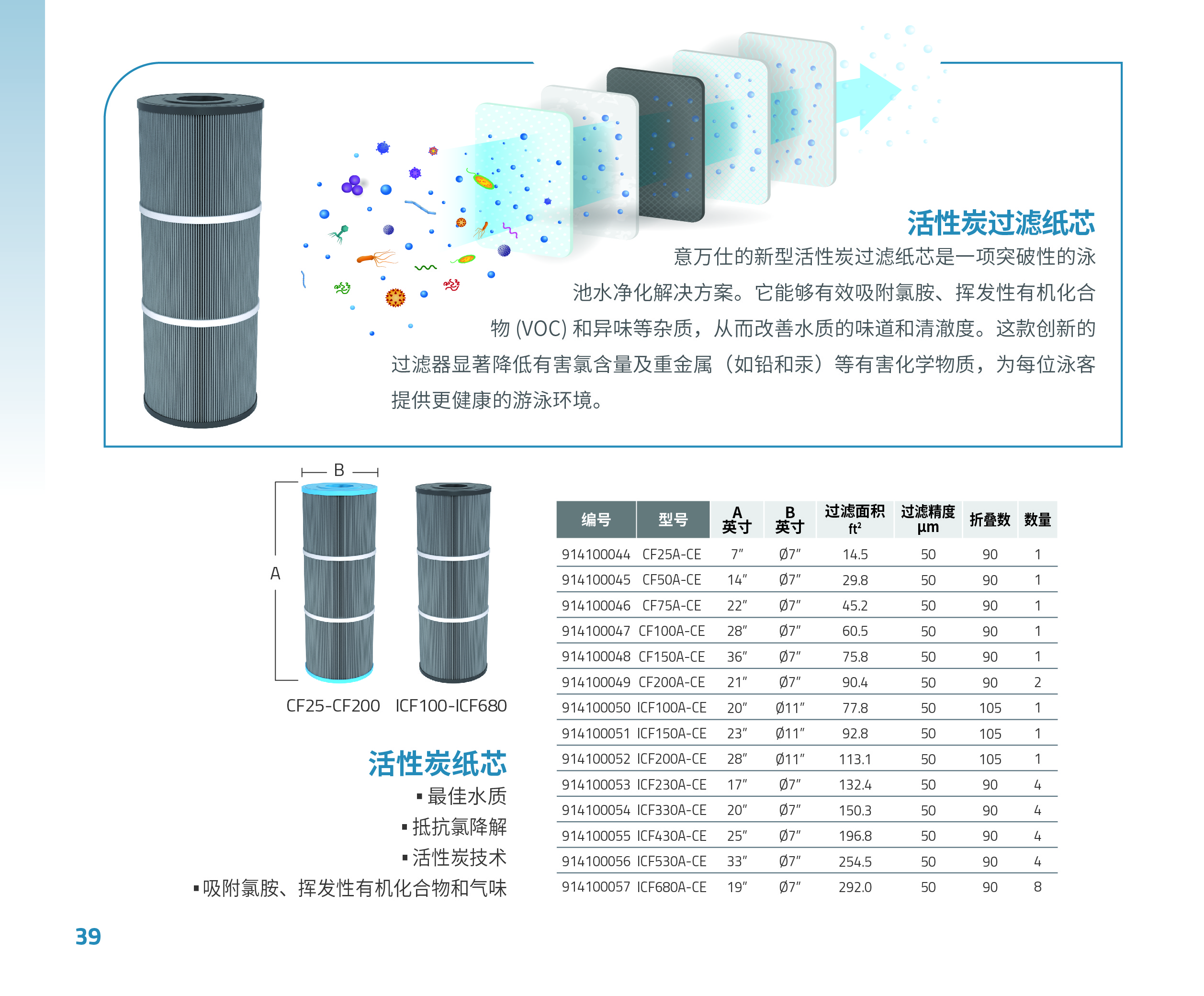 意萬(wàn)仕的新型活性炭過(guò)濾紙芯是一項(xiàng)突破性的泳 池水凈化解決方案。它能夠有效吸附氯胺、揮發(fā)性有機(jī)化合 物 (VOC) 和異味等雜質(zhì),從而改善水質(zhì)的味道和清澈度。這款創(chuàng)新的 過(guò)濾器顯著降低有害氯含量及重金屬(如鉛和汞)等有害化學(xué)物質(zhì),為每位泳客 提供更健康的游泳環(huán)境。