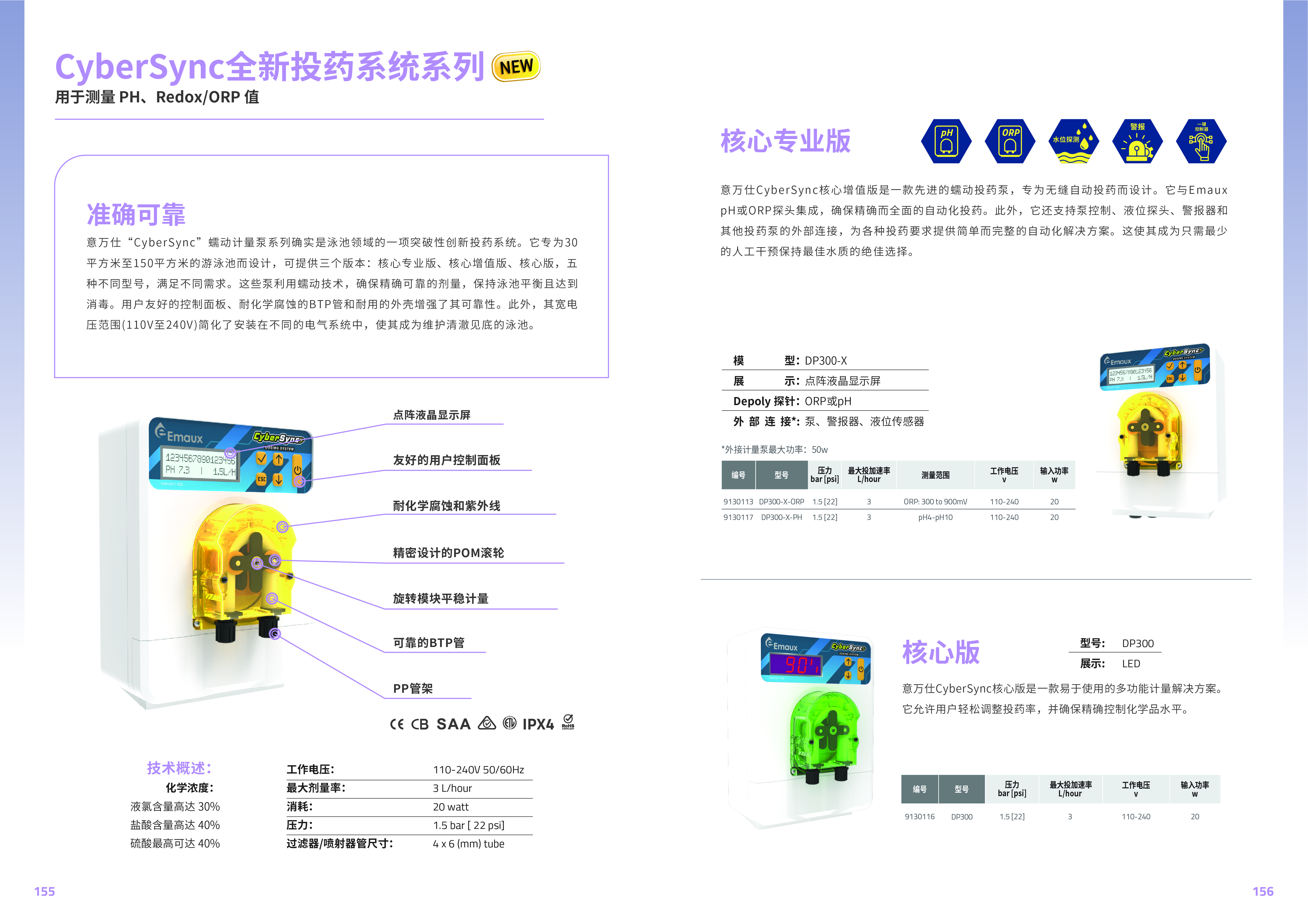 意萬仕“CyberSync”蠕動計量泵系列確實是泳池領(lǐng)域的一項突破性創(chuàng)新投藥系統(tǒng)。它專為30 平方?至150平方?的游泳池?設(shè)計,可提供三個版本:核心專業(yè)版、核心增值版、核心版,五 種不同型號,滿足不同需求。這些泵利用蠕動技術(shù),確保精確可靠的劑量,保持泳池平衡且達(dá)到 消毒。用戶友好的控制?板、耐化學(xué)腐蝕的BTP管和耐用的外殼增強(qiáng)了其可靠性。此外,其寬電 壓范圍(110V至240V)簡化了安裝在不同的電?系統(tǒng)中,使其成為維護(hù)清澈見底的泳池。