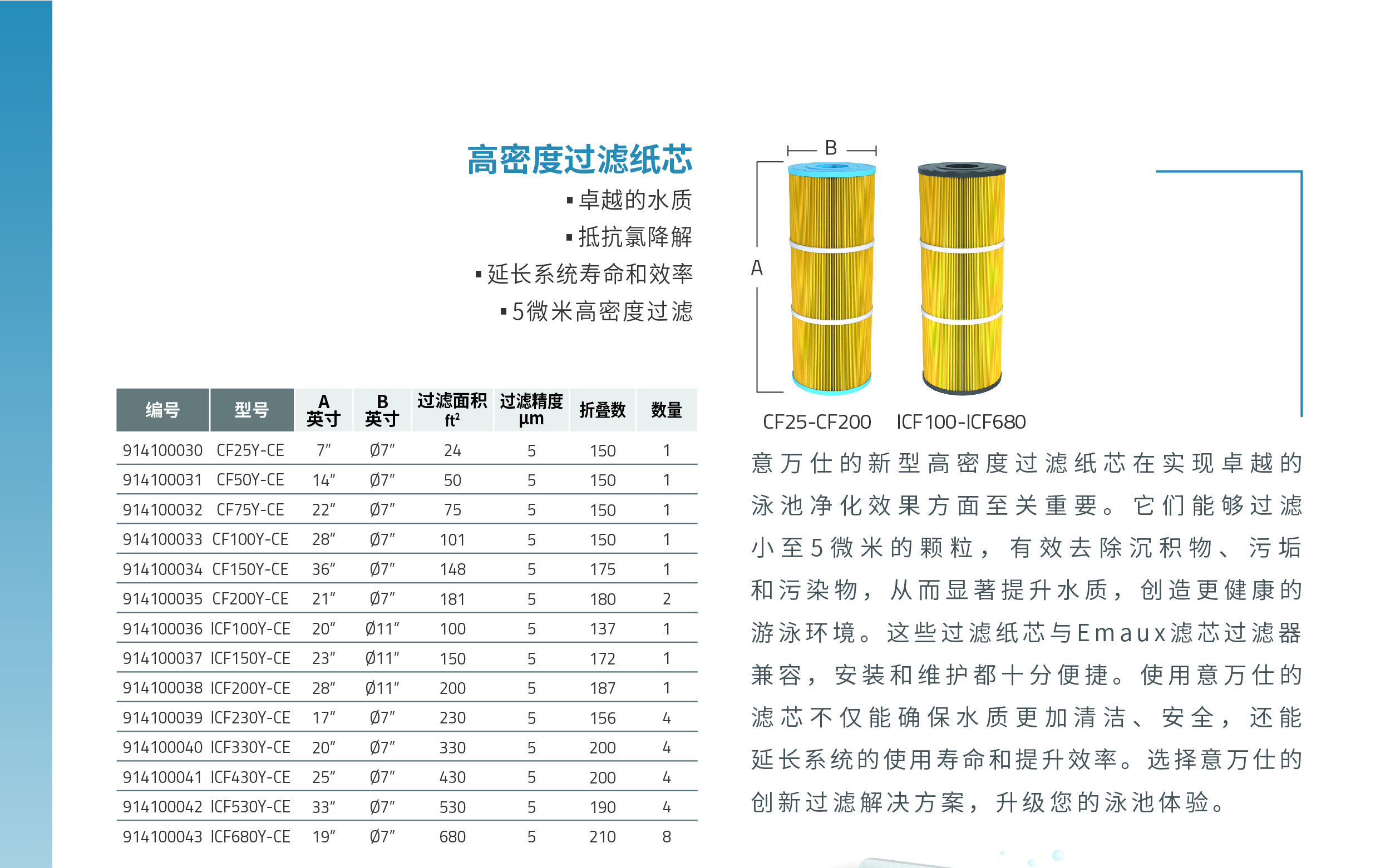 意萬仕的新型高密度過濾紙芯在實(shí)現(xiàn)卓越的 泳池凈化效果方面至關(guān)重要。它們能夠過濾 小至5微米的顆粒,有效去除沉積物、污垢 和污染物,從而顯著提升水質(zhì),創(chuàng)造更健康的 游泳環(huán)境。這些過濾紙芯與Emaux濾芯過濾器 兼容,安裝和維護(hù)都十分便捷。使用意萬仕的 濾芯不僅能確保水質(zhì)更加清潔、安全,還能 延長系統(tǒng)的使用壽命和提升效率。選擇意萬仕的 創(chuàng)新過濾解決方案,升級您的泳池體驗(yàn)。