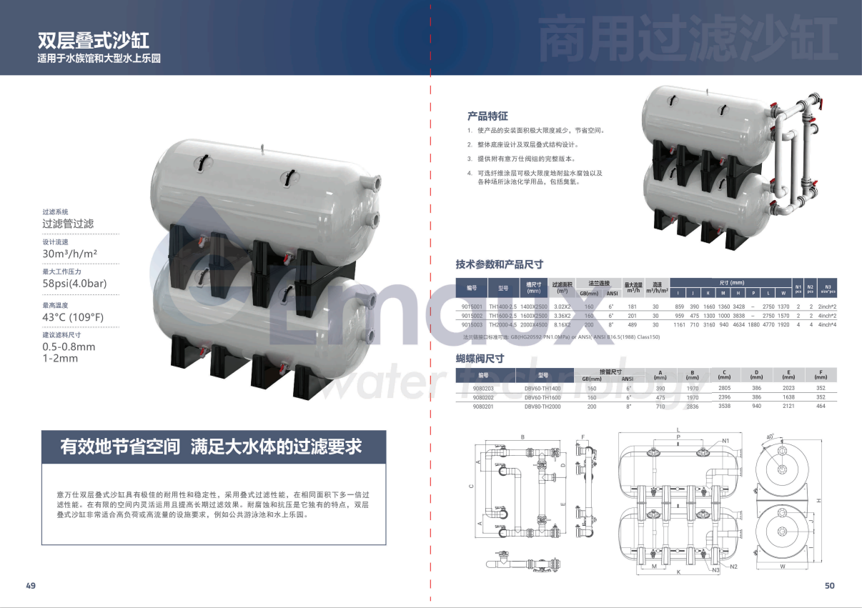 競技池意萬仕雙層疊式沙缸具有極佳的耐用性和穩(wěn)定性,采用疊式濾性能,在相同面積下多一倍過濾性能。在有限的空間內(nèi)靈活運用且提高長期過濾效果。耐腐蝕和抗壓是它獨有的特點。雙層疊式沙缸非常適合高負荷或高流量的水設(shè)施,例如公共游泳池和水上樂園。