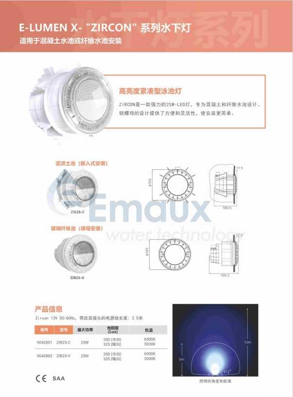 競技池ZIRCON是一款強力的25W-LED燈,專為混凝土和纖維水池設計。 鎖螺母的設計提供了方便和靈活性,使安裝更簡單。