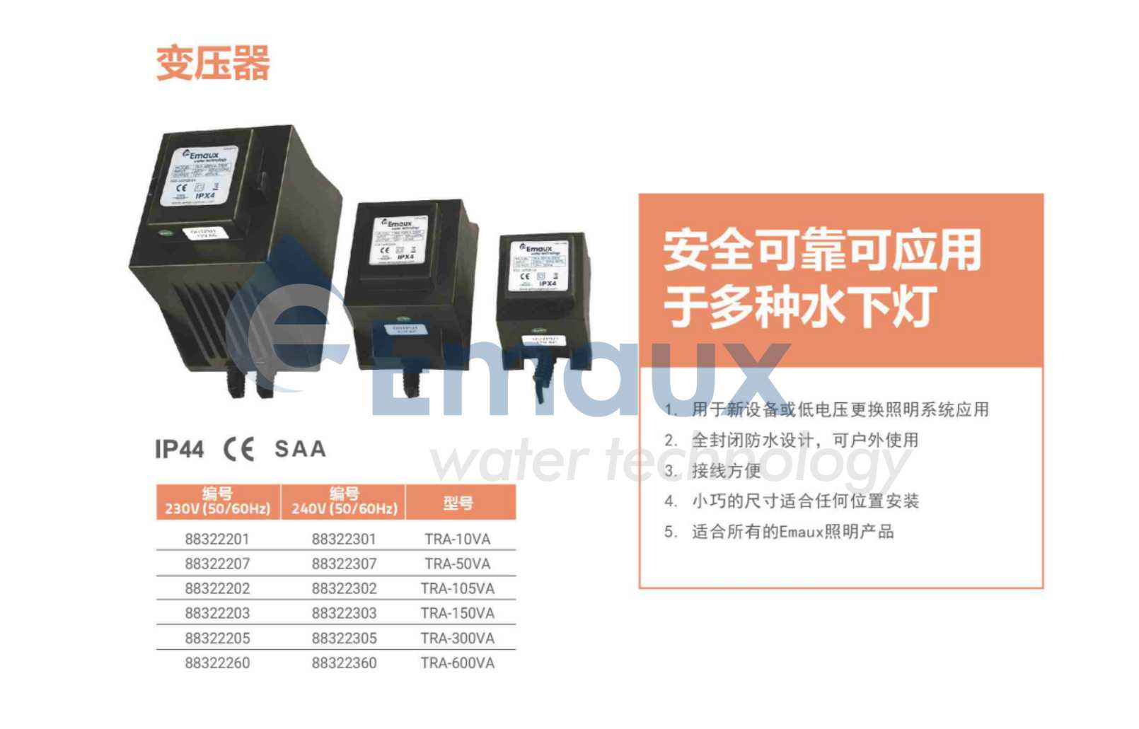 1. 用于新設備或低電壓更換照明系統(tǒng)應用 2. 全封閉防水設計,可戶外使用 3. 接線方便 4. 小巧的尺寸適合任何位置安裝 5. 適合所有的Emaux照明產品