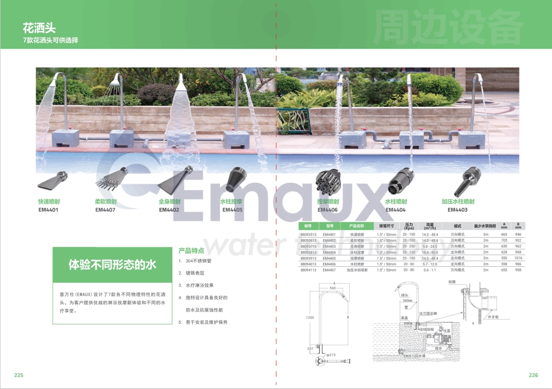 競技池意萬仕(EMAUX)設(shè)計(jì)了7款各不同物理特性的花灑頭,為客戶提供優(yōu)越的淋浴按摩新體驗(yàn)和不同的水療享受。