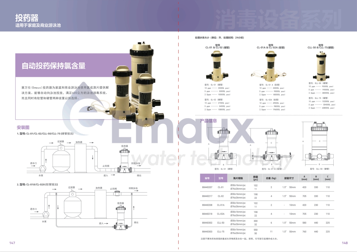 競(jìng)技池意萬仕(Emaux)投藥器為家庭和商業(yè)游泳池使用氯或溴片提供解決方案。能夠自動(dòng)向泳池投放,滿足600立方的泳池消毒系統(tǒng)。而且同時(shí)有軟管和硬管兩種裝置以供選擇。