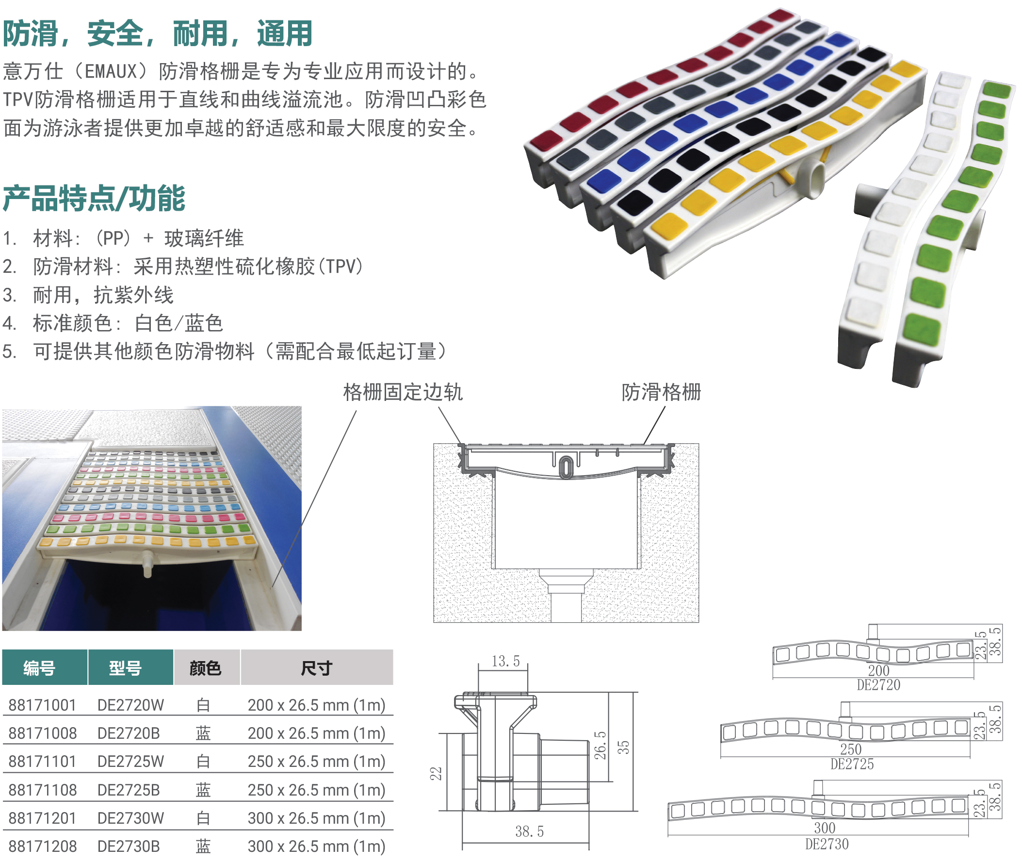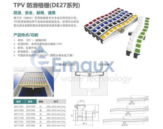 您的位置:首頁>產(chǎn)品概覽>泳池格柵>TPV 防滑格柵(DE27系列)