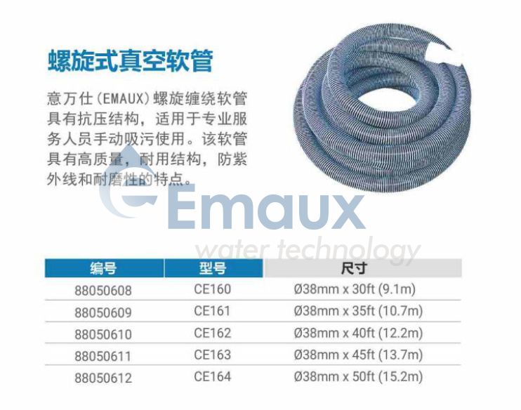 競技池意萬仕(EMAUX)螺旋纏繞軟管具有抗壓結(jié)構(gòu),適用于專業(yè)服務(wù)人員手動吸污使用。該軟管具有高質(zhì)量,耐用結(jié)構(gòu),防紫外線和耐磨性的特點(diǎn)。