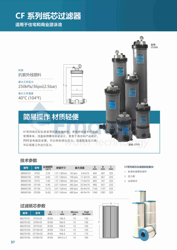 競(jìng)技池CF系列紙芯缸缸身采用防紫外線材料,更有效地延長(zhǎng)產(chǎn)品的使用壽命。頂蓋采用螺母鎖緊設(shè)計(jì),更易于清潔和產(chǎn)品維護(hù),同時(shí)設(shè)有減壓裝置,可以輕松排出壓力,頂蓋配備壓力表,可以觀察工作運(yùn)行壓力